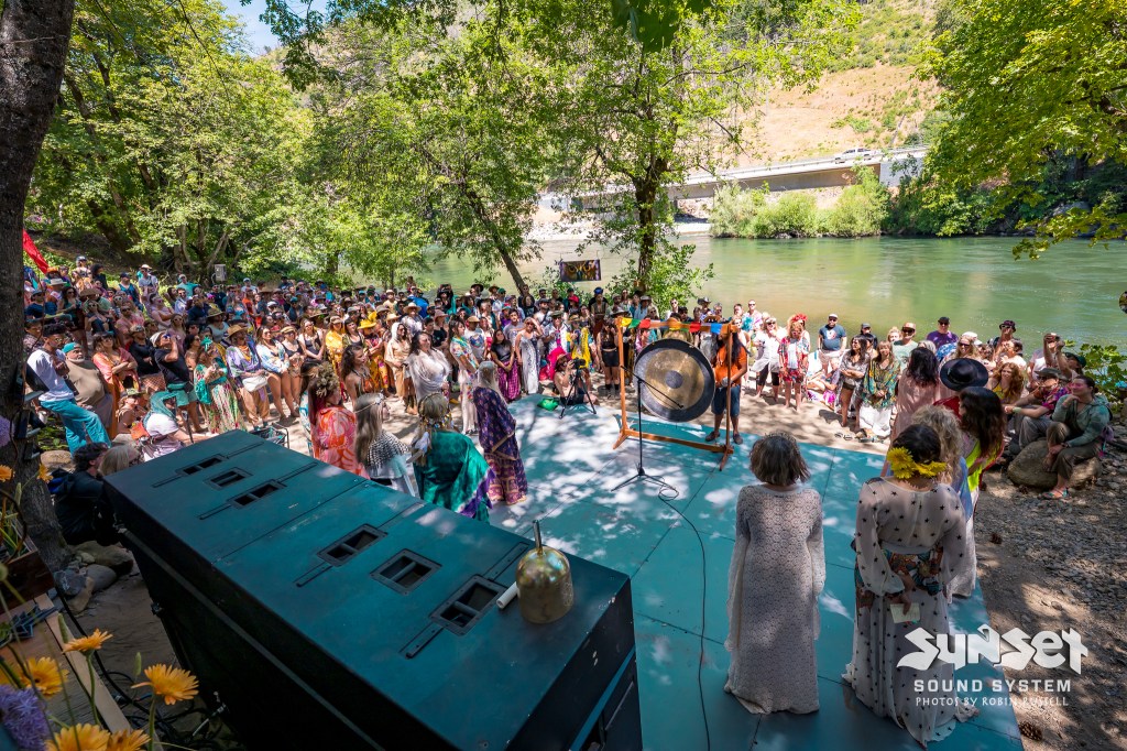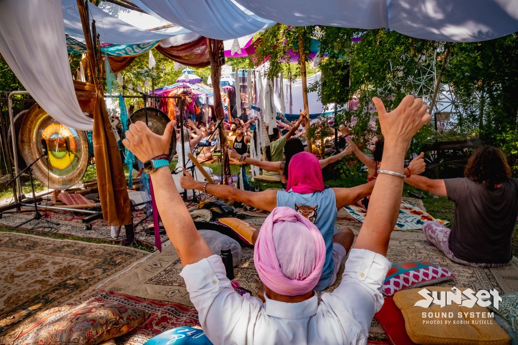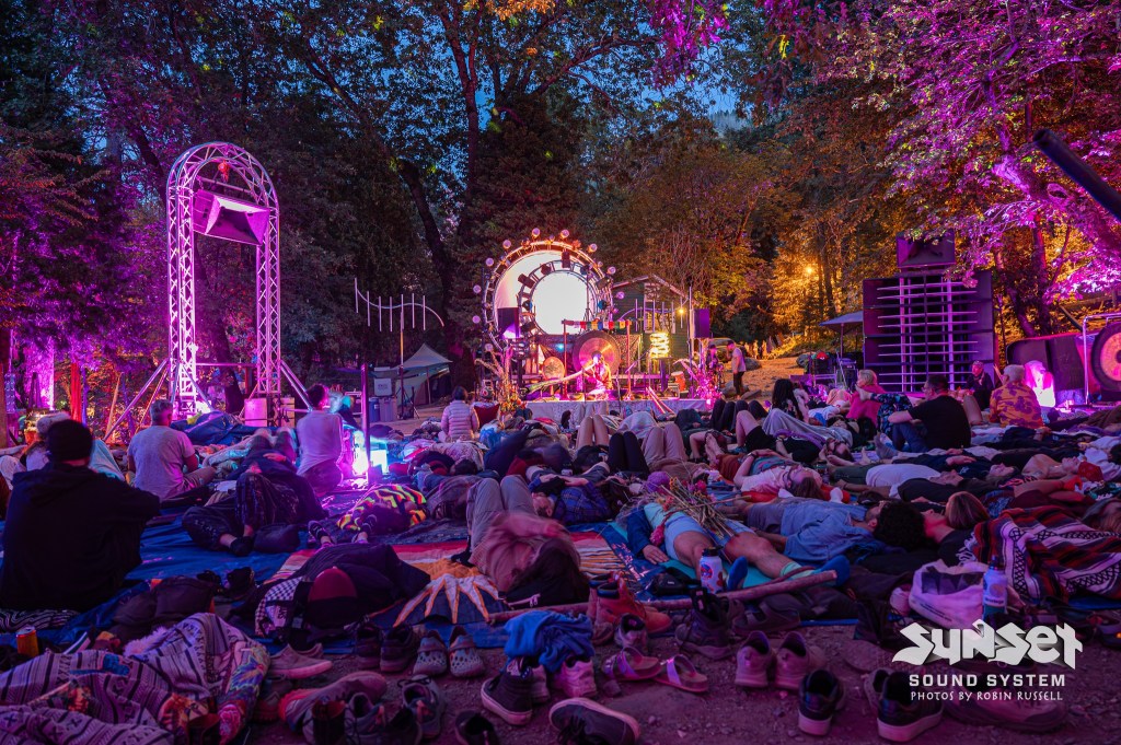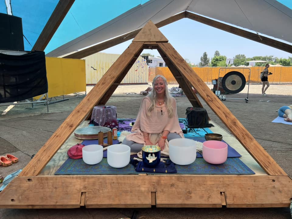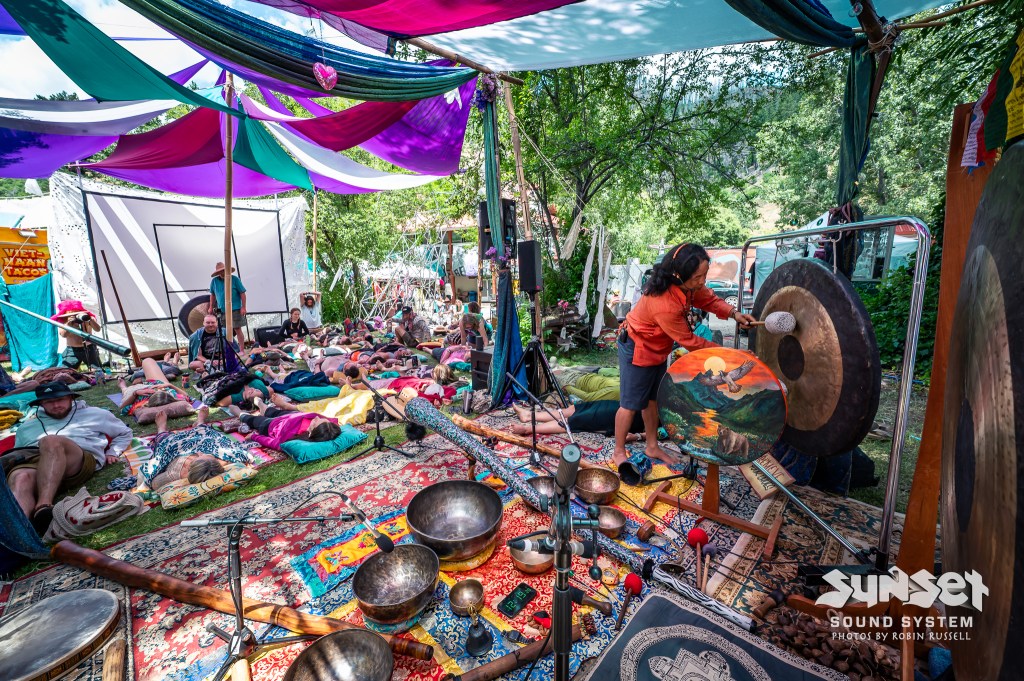 Events include festivals and event spaces like Sunset Campout Music & Art Festival, Sunset Sound System Park Events, Lightning in a Bottle, San Francisco Buddhist Center, the Global Sound Healing Conference, Hog Farm Hideaway Festival, Days Between Festival, Gaia Gathering Retreat, and her own holistic health events.